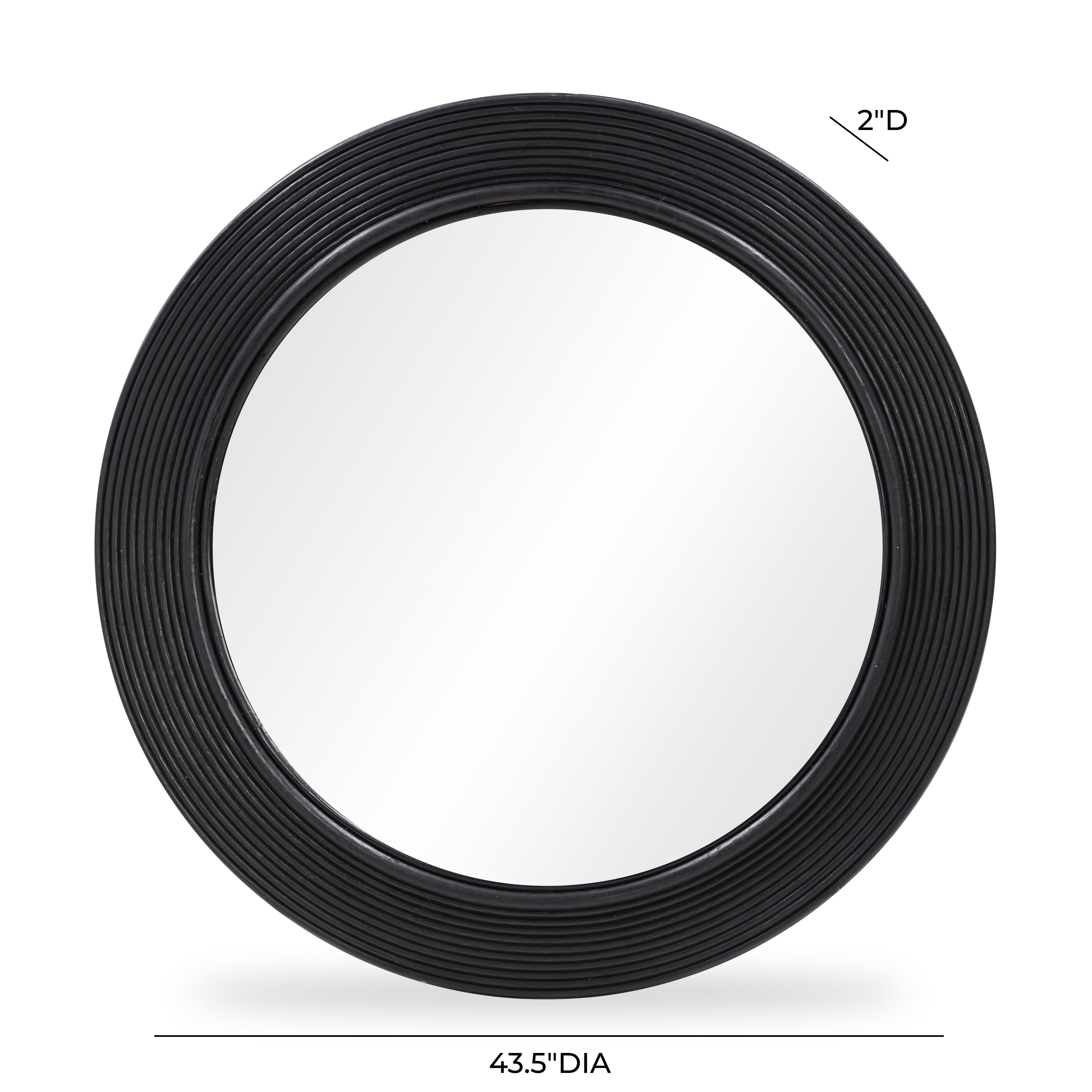 The Tanya Rattan 43.5" Round Mirror radiates breezy boho energy with its fluted rattan frame and warm, natural texture. In black or natural cane, this effortlessly cool accent adds depth and dimension to your walls without trying too hard.