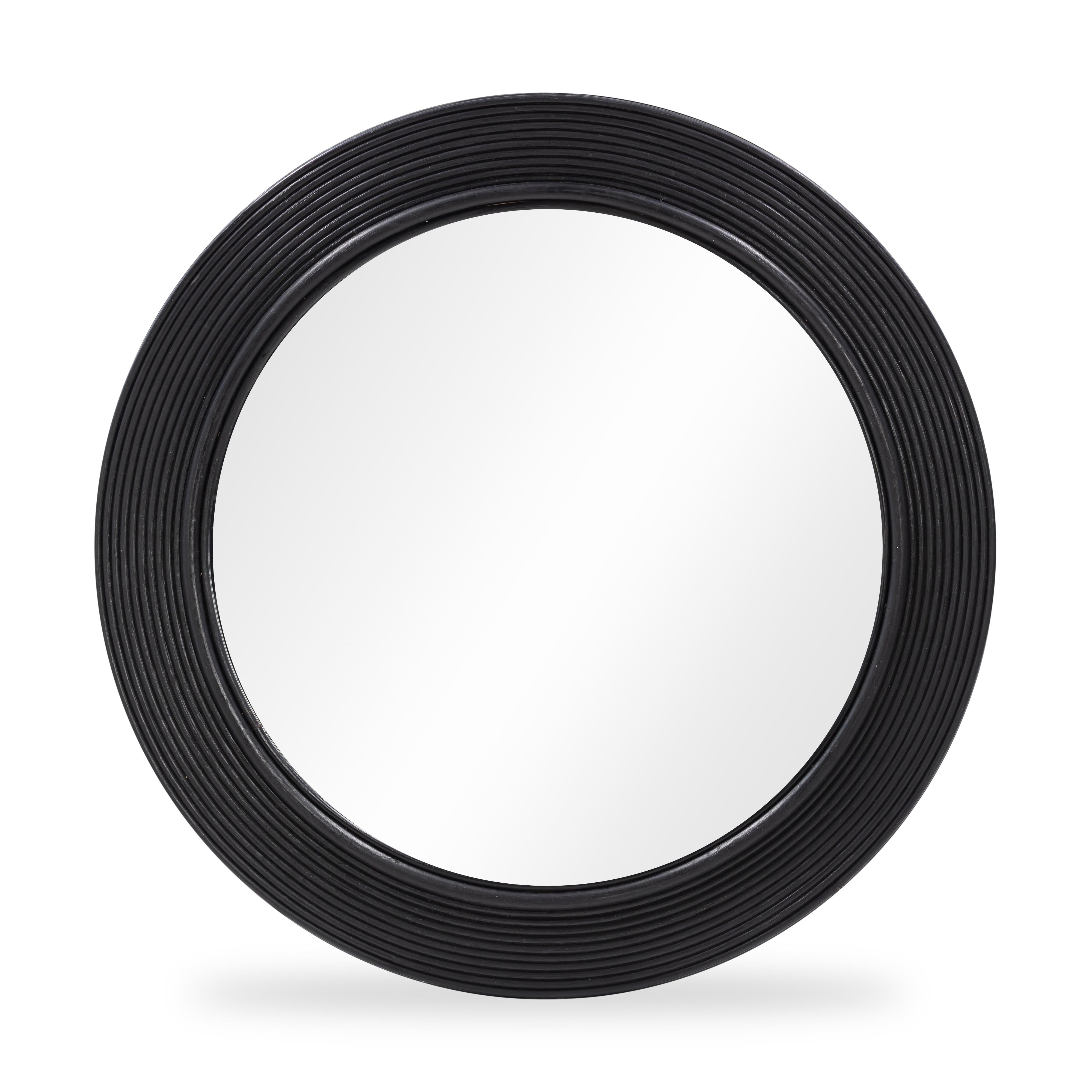 The Tanya Rattan 43.5" Round Mirror radiates breezy boho energy with its fluted rattan frame and warm, natural texture. In black or natural cane, this effortlessly cool accent adds depth and dimension to your walls without trying too hard.