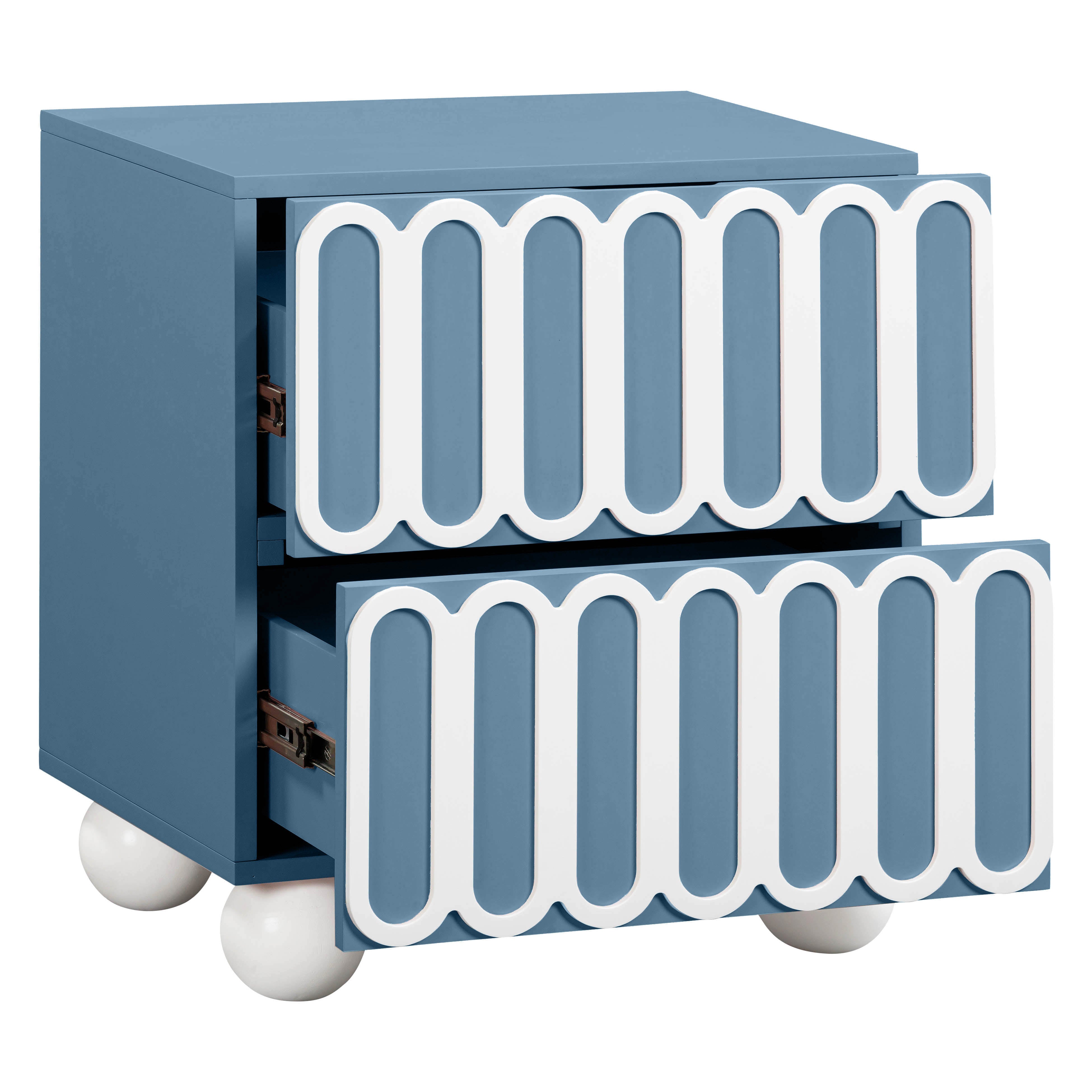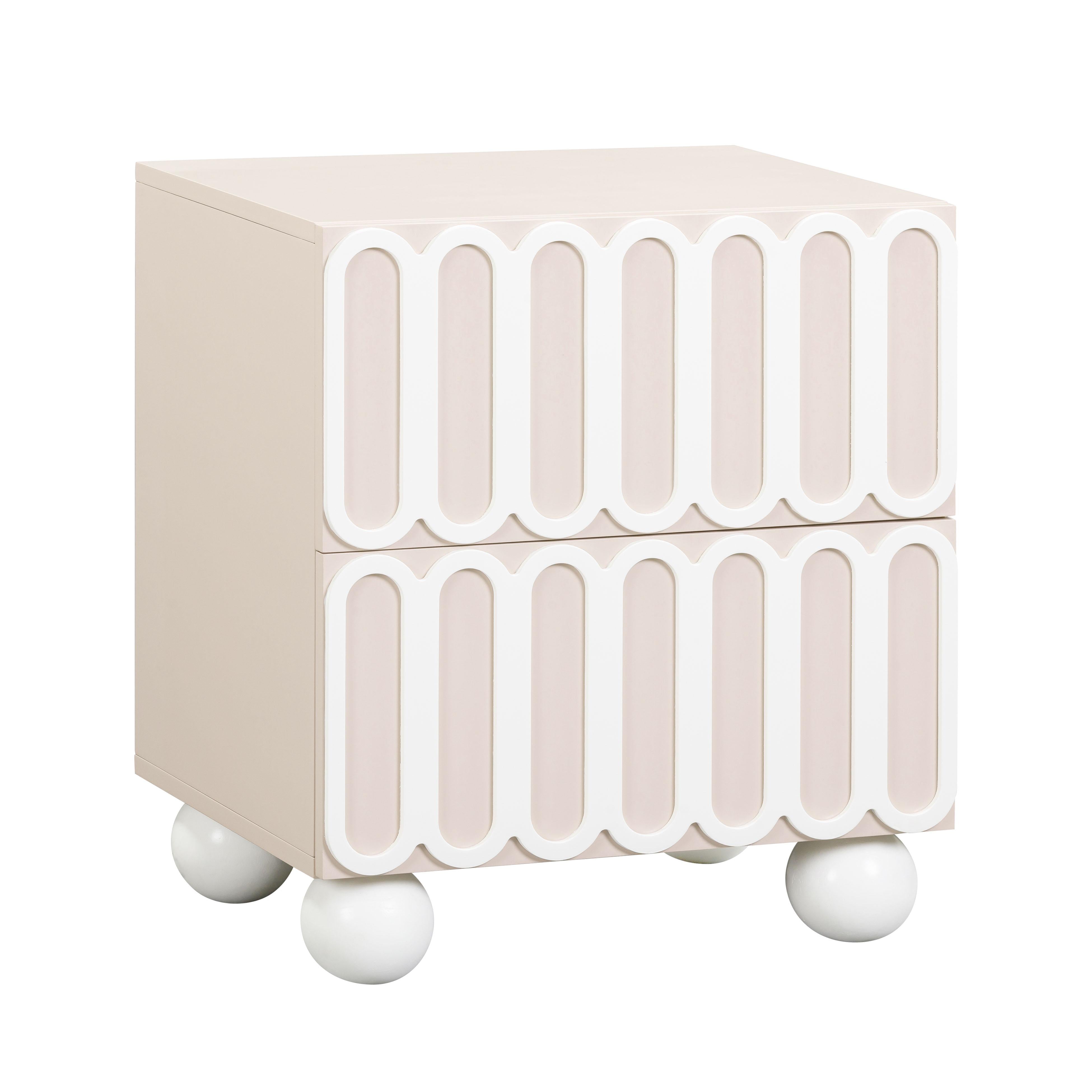 Say goodbye to a boring bedtime routine with the Tori Motif Nightstand, available in dreamy mauve and sophisticated taupe, each featuring a statement-making facade that truly pops. Its solid wood, spherical legs infuse a sculptural Hollywood buzz, while the medium sheen on the surfaces delivers just the right amount of drama without fussy maintenance. Plus, the nightstand's drawers glide smoothly on soft-close rails, ensuring you keep the morning peace, not waking your partner as you start your day.