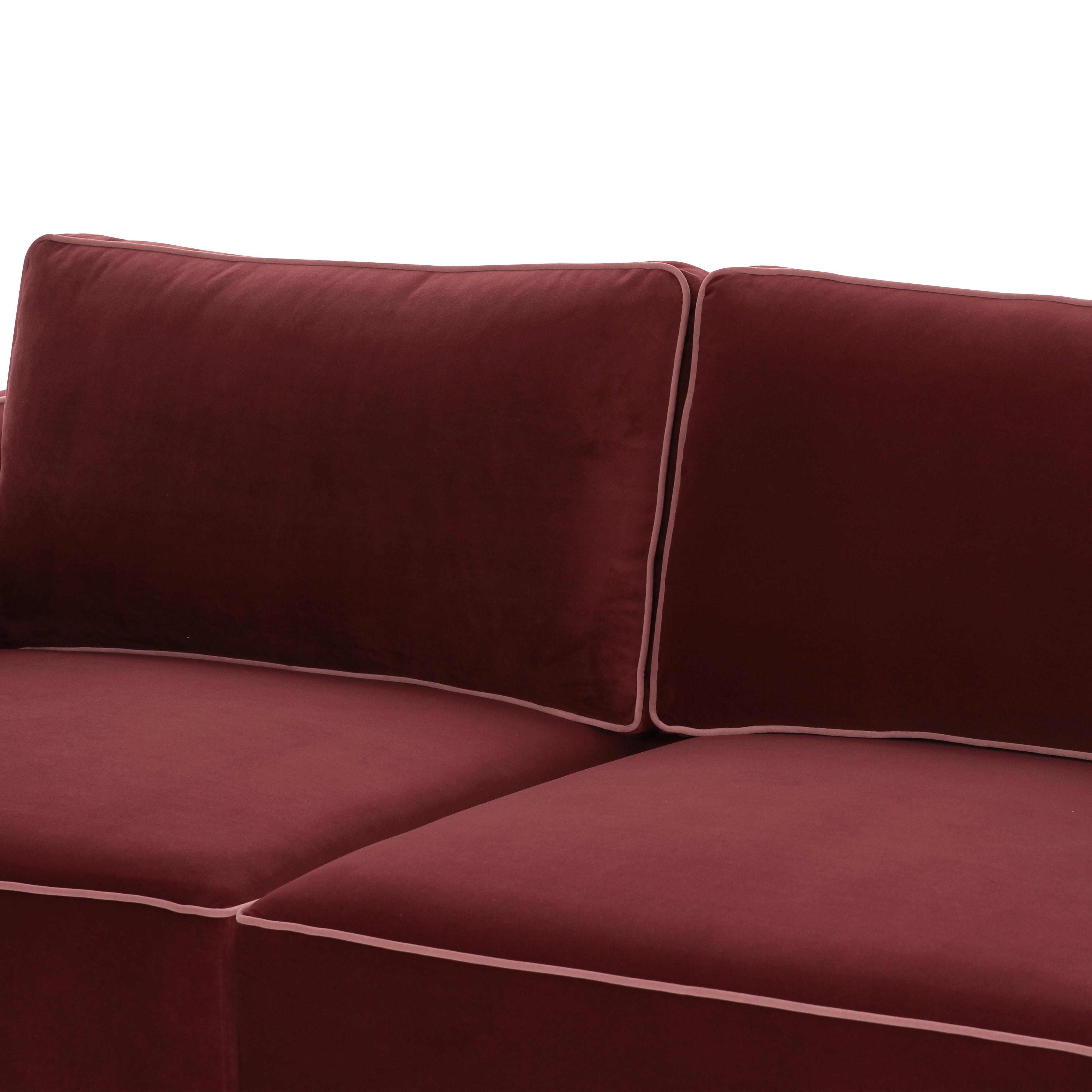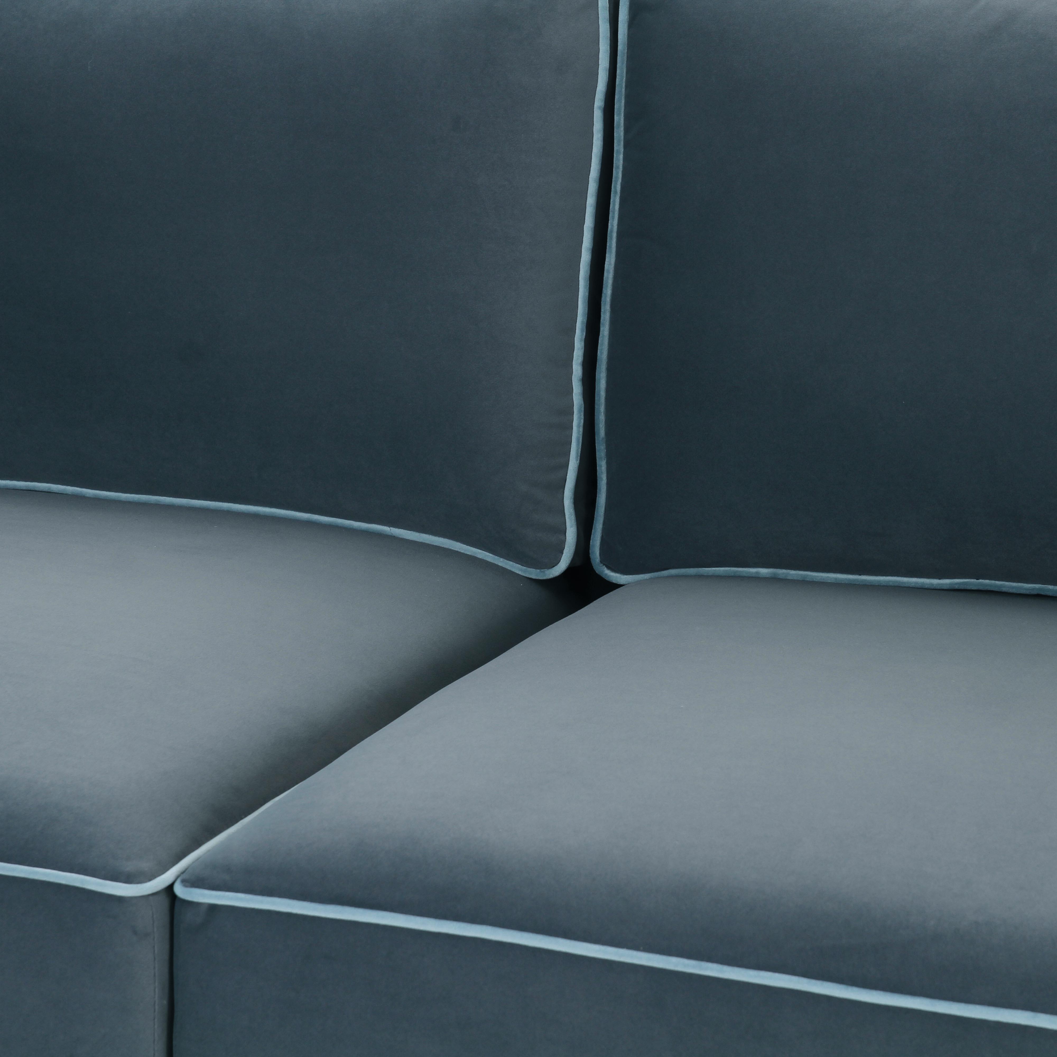 Discover the timeless elegance of the Willow Sectional, a modular masterpiece upholstered in luxurious velvet. This sectional features striking contrast piping in the sophisticated hues of Berry Red, a rich burgundy accented with mauve piping, and Misty Blue, a serene grey-blue with delicate pale blue piping. For those who prefer classic simplicity, the Willow Sectional is also available in solid velvet colors including Taupe, Navy, and Charcoal. With its versatile modular design and plush comfort, the Willow Sectional is the perfect centerpiece for a modern, stylish home.