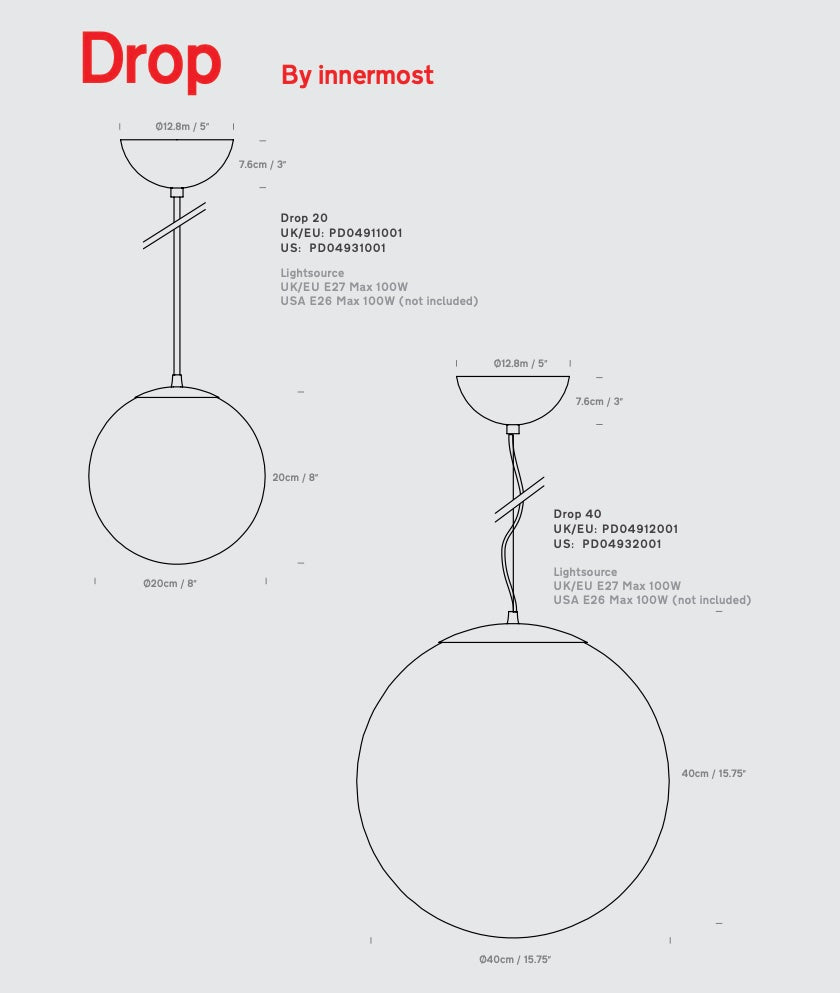 Dimensions | Drop 20: 8" D x 8" H, Drop 40: 15.75" D x 15.75" H |